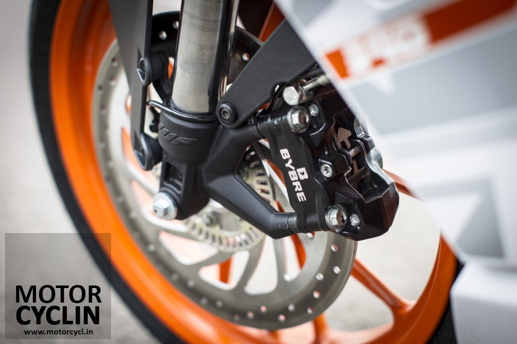 Comes with ABS, 300 mm in the front and 240mm at the rear. Ample stopping power for C1 in Kari Motor Speedway having flown down the straight. I assume.